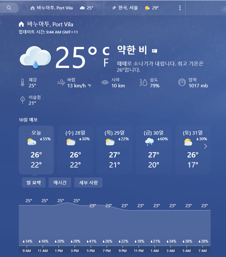 위 이미지는 바누아투 날씨 예보입니다. 7월달엔 건기철 시작이고, 대부분 영상 15도로 강추위(?)로 인해 무척 추워야 정상인데, 지금은 약간의 추위만 느낄 뿐 춥다는 느낌은 없고, 흐리고 비 예보입니다. (우리 집은 바닷가여서 바람이 많아 내륙보다는 좀 더 춥습니다. 영상 25도인데도 바람 때문에 좀 춥습니다.)