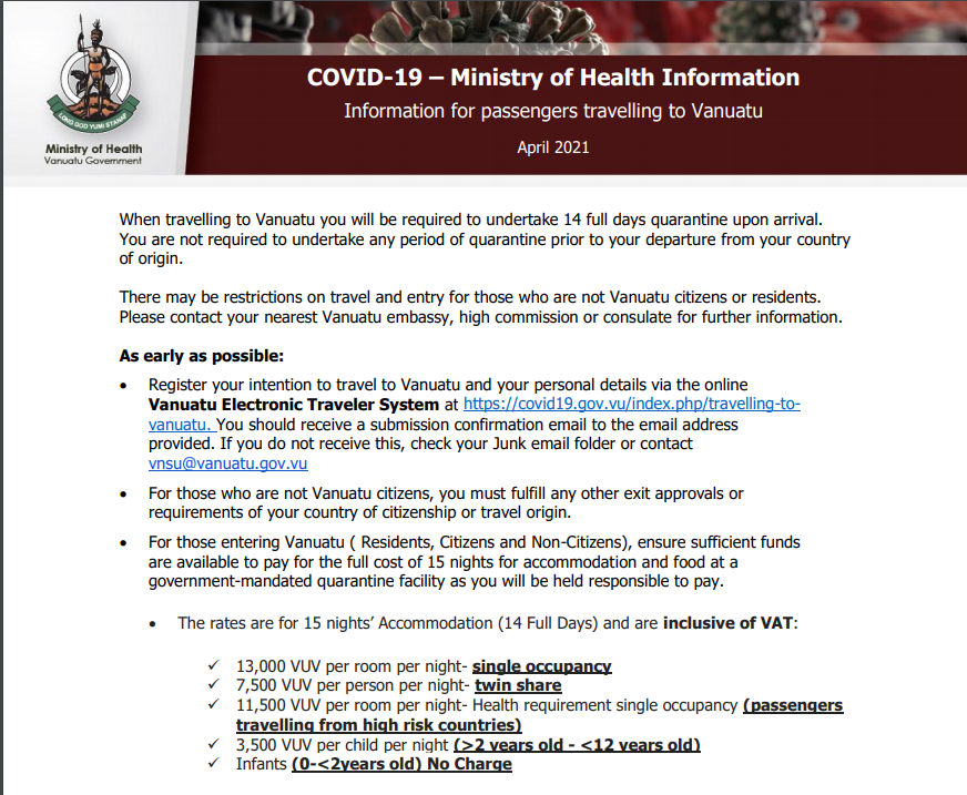 기타 자세한 내용은 Vanuatu Ministry of Health COVID-19 Updates - Travellers (gov.vu) 참고하시기 바랍니다.