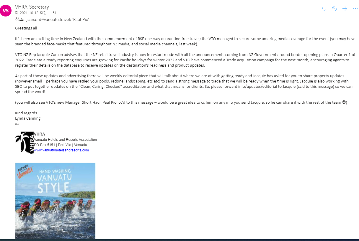 바누아투 호텔 리조트 협회에서 온 공문을 소개 합니다. 2022년 뉴질랜드 국경 개방과 함께 뉴질랜드 바누아투간 항공로가 열릴 것으로 기대하고 있다는 소식입니다.