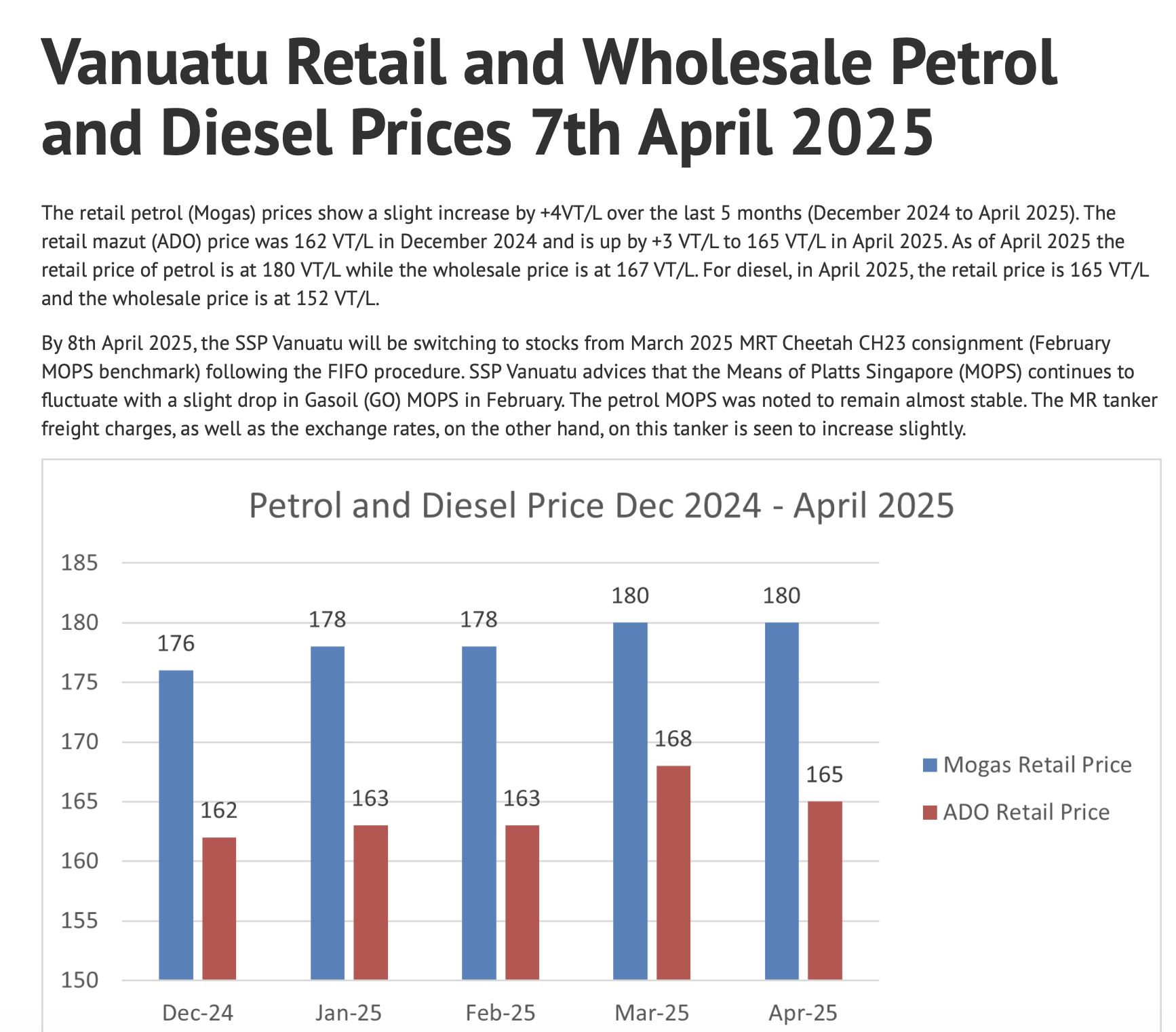 바누아투는 석유와 가스를 자체 생산하지 않고 대부분 수입에 의존합니다. 바누아투 에너지부 자료에 따르면, 국내 주유소 가격은 국제 석유 벤치마크인 싱가포르 MOPS(Mean of Platts Singapore), 해상운임, 환율 등의 영향을 받습니다. 2025년 4월 연료 가격 발표에서도 정부는 MOPS 변동, MR 탱커 운임, 환율 변화가 국내 가격에 영향을 준다고 직접 설명했습니다. 출처 : DOE